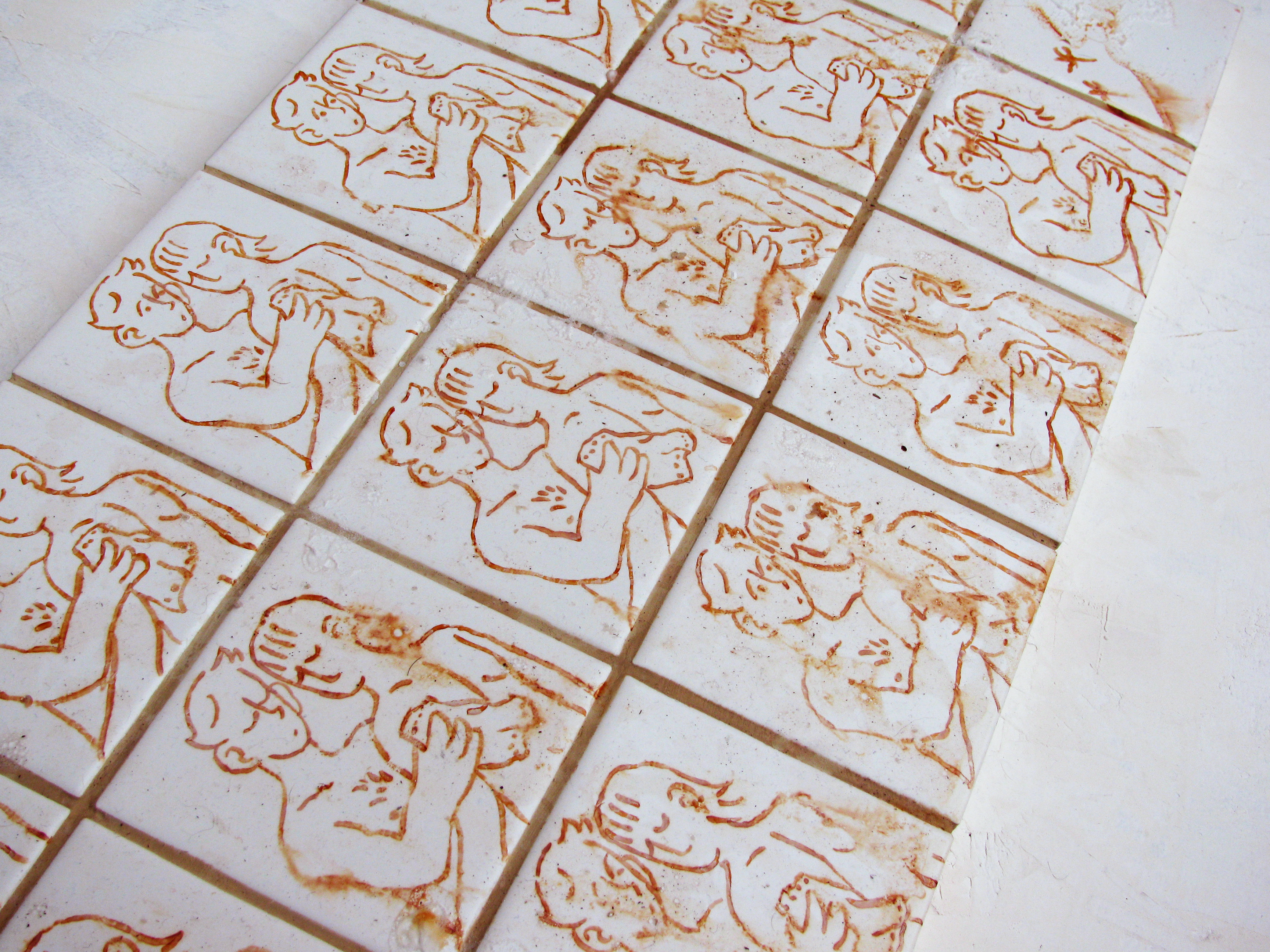 Soap Scum is a set of ceramic bathroom tiles, grouted and mounted, with animation frames drawn on. The tiles were covered in soap, water, shaving cream, and left to coagulate and accumulate debris in the same manner an uncleaned bathroom does.